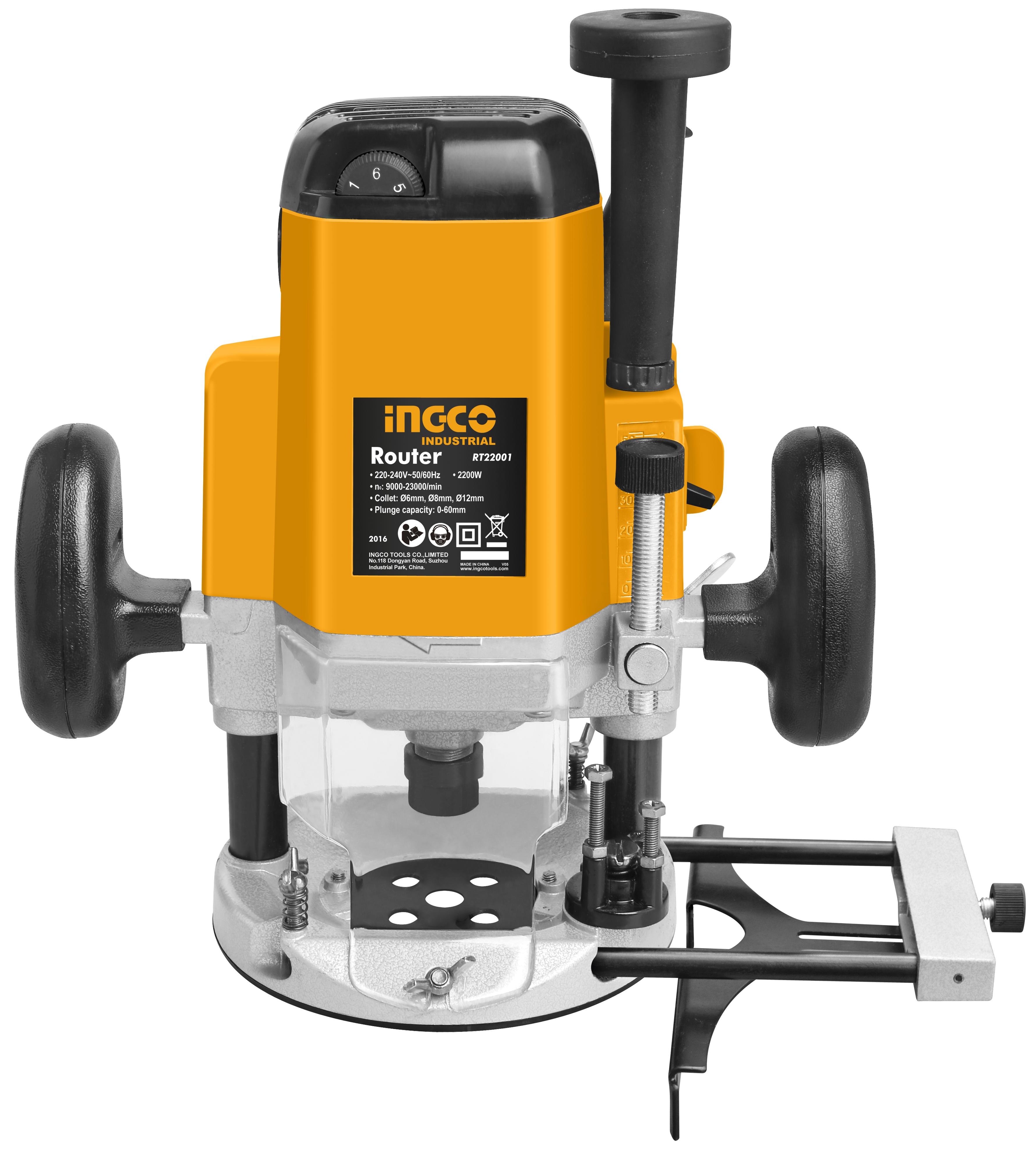 Voltaje: 220-240V~50Hz Potencia:2200W Velocidad:9000-23000rpm Capacidad de Fresas:6,8,12mm Profundidad:0-60mm 1pcs coping ring,1pcs guia de aluminio,1set paralle guide,1pcs llave Packed by color box