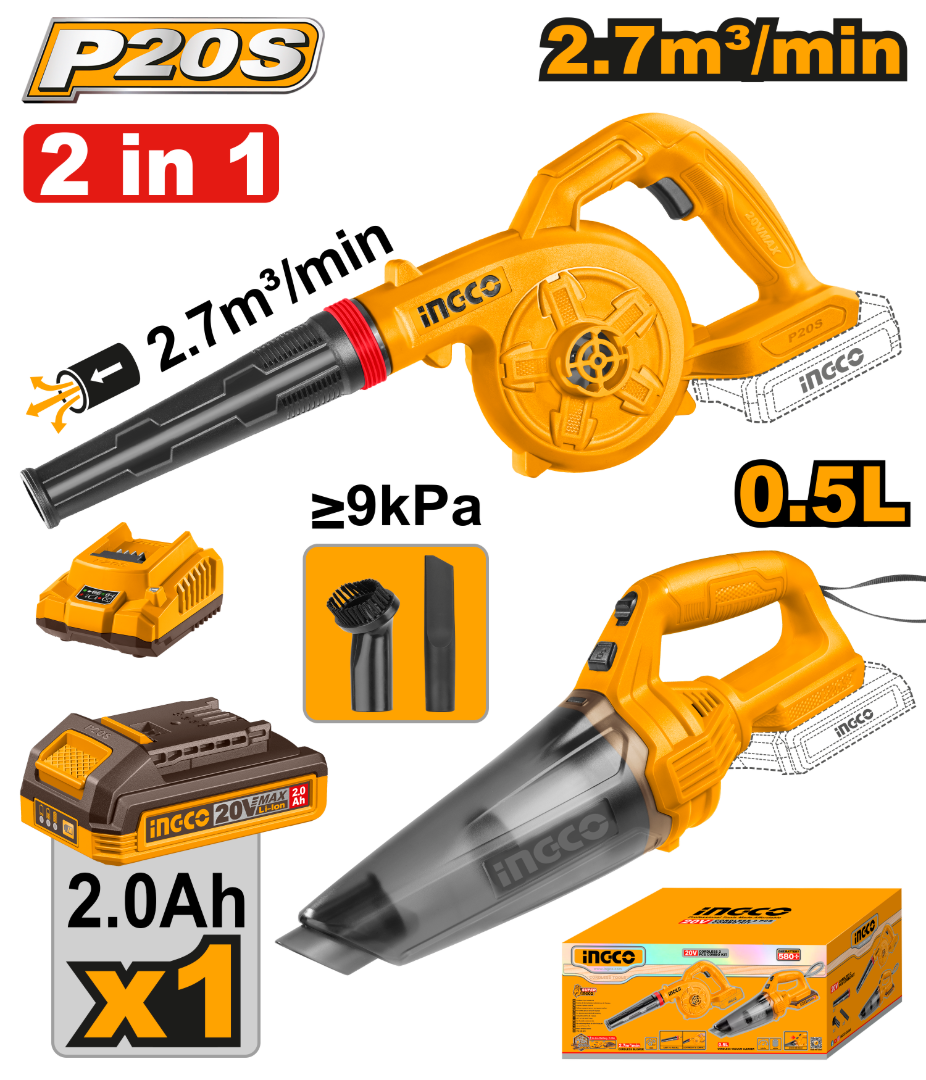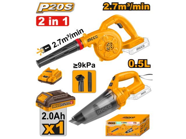 KIT A BATERÍA 20V P20S SOPLADORA + ASPIRADORA 0.5L C/BATERÍA, CARGADOR Y ACCESORIOS INGCO COSLI240998