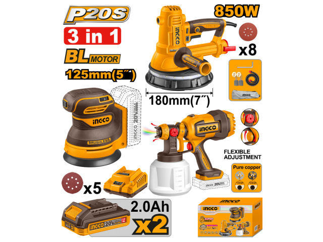 KIT A BATERIA P20S 20V LIJADORA DE YESO 850W 180MM 7" + LIJADORA ROTO ORBITAL 125MM 7" + PISTOLA DE PINTAR + 2 BAT, CARGADOR Y ACCESORIOS