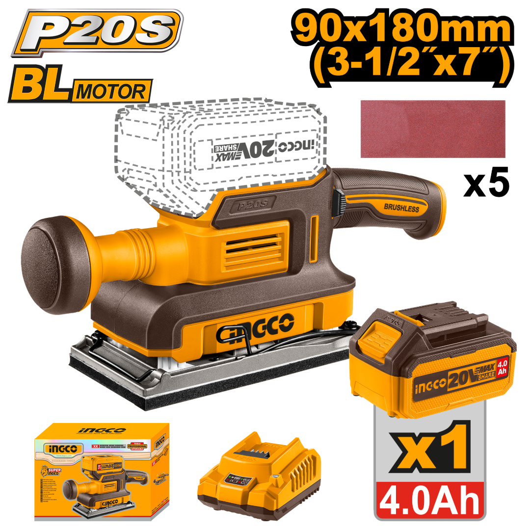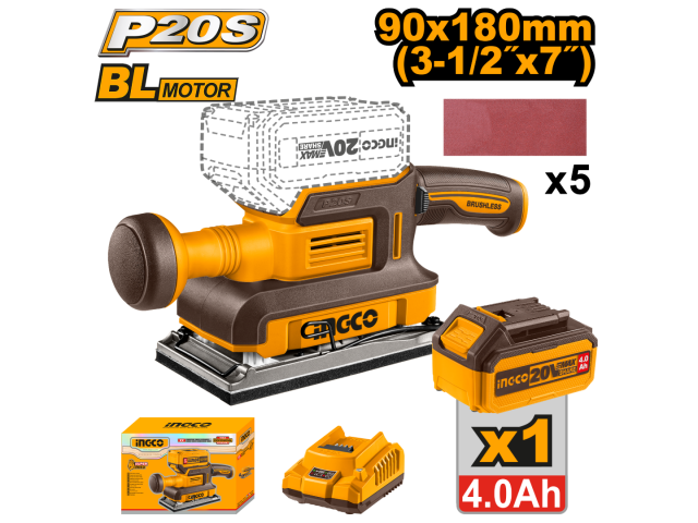 LIJADORA ORBITAL A BATERÍA BRUSHLESS MOTOR 20V P20S C/BAT + CARGADOR + 5 LIJAS INGCO CFSLI20311