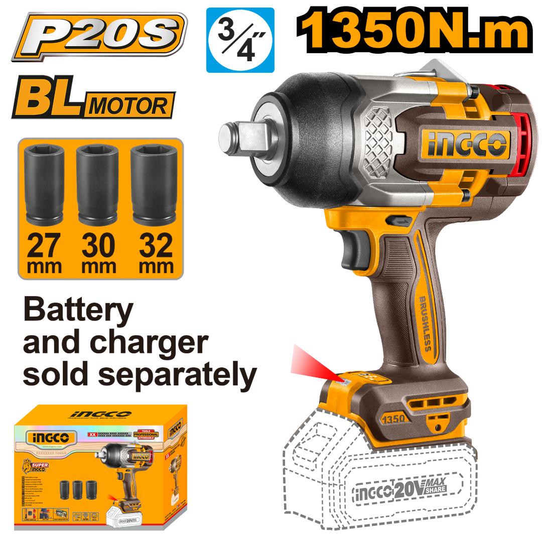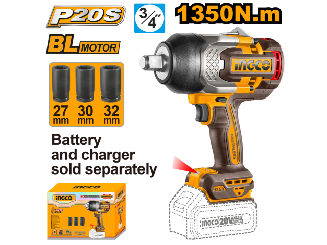 LLAVE DE IMPACTO A BATERIA BRUSHLESS 3/4" 1350NM P20S 20V + 3 DADOS 27,30,32MM S/BAT S/CARG INGCO CIWLI201351