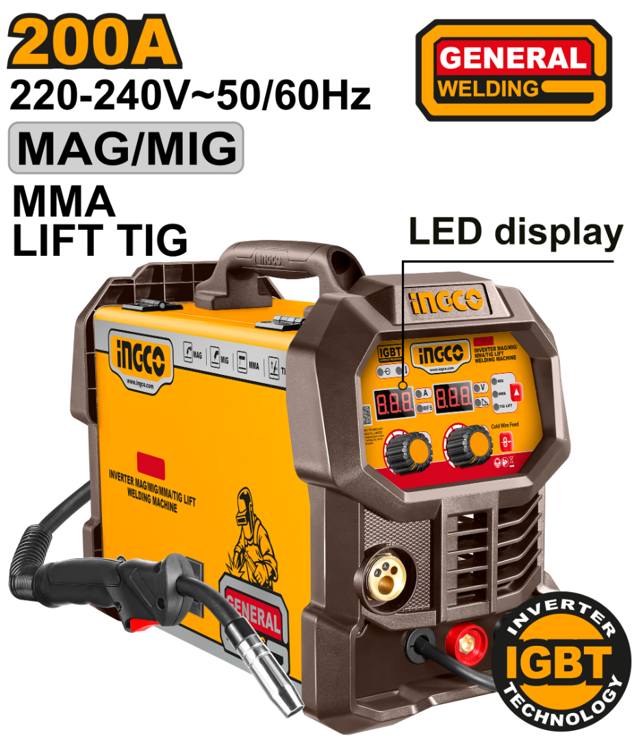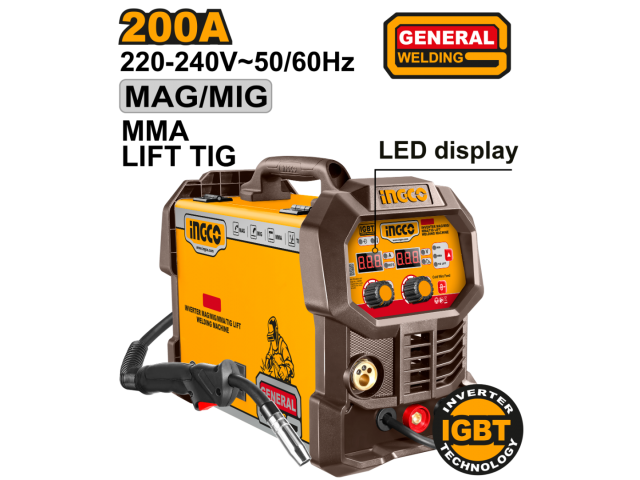 SOLDADORA INVERTER MAG/MIG/MMA/TIG 200A 220V CON ACCESORIOS INGCO ING-MGT20058