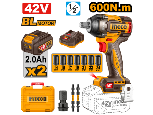 LLAVE DE IMPACTO A BATERIA 42V BRUSHLESS 600NM 1/2" C/ 2 BAT 2.0AH, CARGADOR, ACCESORIOS + VALIJA