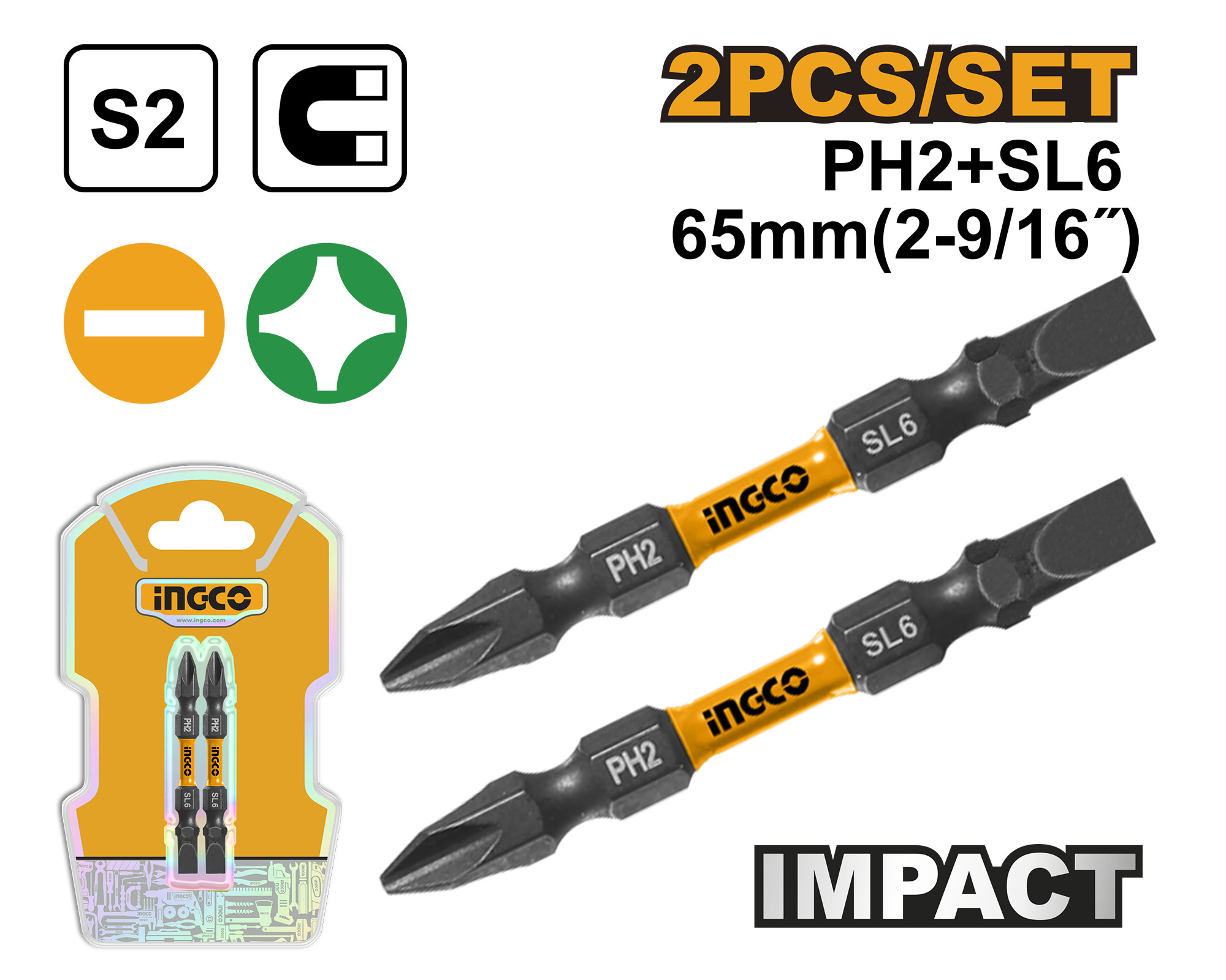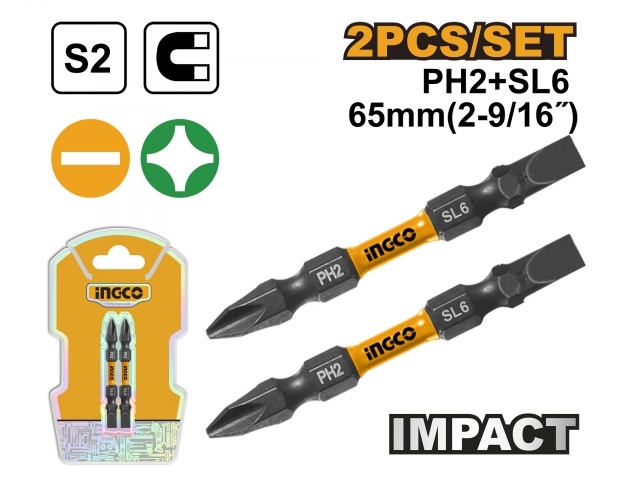 SET X2 PUNTAS IMPACTO PH2+SL6 65MM IMANTADAS S2 INGCO SDBIM72HL665