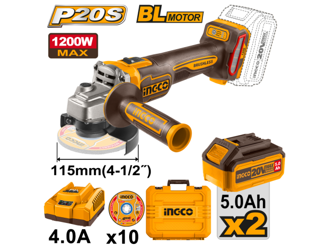 AMOLADORA A BATERIA 4 1/2" 20V P20S C 2 X 5AH BAT CARG Y VALIJA INGCO CAGLI2211532