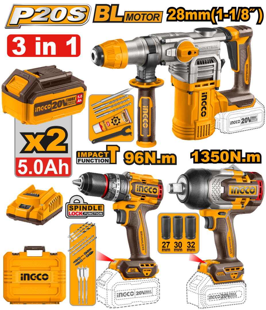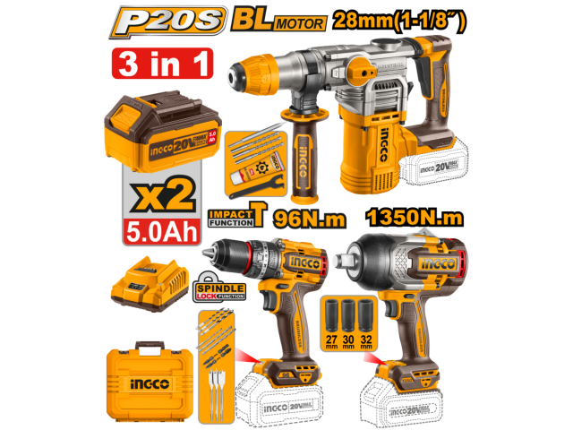 KIT COMBO A BATERIA P20S ROTOMARTILLO 28MM + TALADRO ATORNILLADOR C/PERCUTOR 96NM + LLAVE DE IMPACTO 3/4" 1350NM C/2 BAT, CARGADOR, VALIJA + ACCESORIOS INGCO COSLI250281 OTP