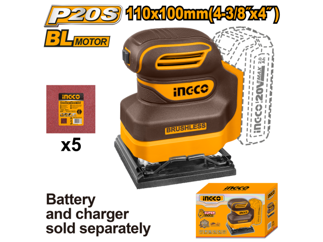 LIJADORA ORBITAL 20V P20S + 5 LIJAS SIN BAT SIN CARG INGCO CSHSLI2024