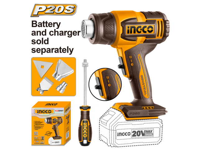 PISTOLA DE CALOR A BATERÍA P20S 20V CON ACCESORIOS S/BAT Y S/CARG INGCO HGLI2006