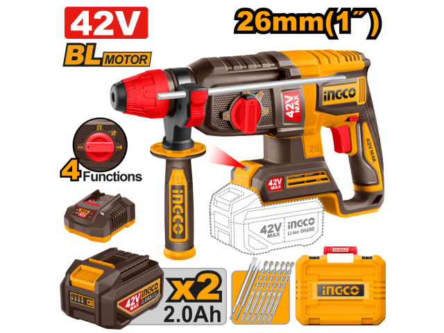 ROTOMARTILLO A BATERIA 42V BRUSHLESS SDS PLUS 2.5J + 6 MECHAS + 2 CINCEL + 2 BAT 2.0AH + CARGADOR + VALIJA