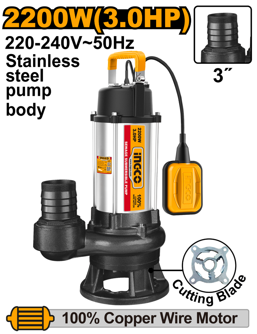 BOMBA POZO NEGRO CON TRITURADOR 2200W 3HP 13MT 3" 38M3/H INGCO SPDB220068