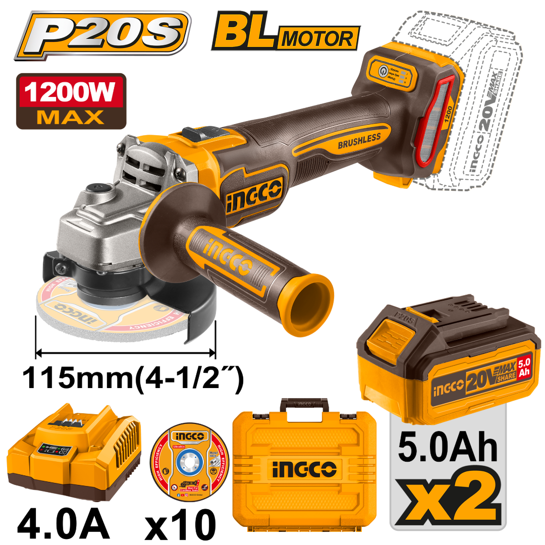 AMOLADORA A BATERIA 4 1/2" 20V P20S C 2 X 5AH BAT CARG Y VALIJA INGCO CAGLI2211532