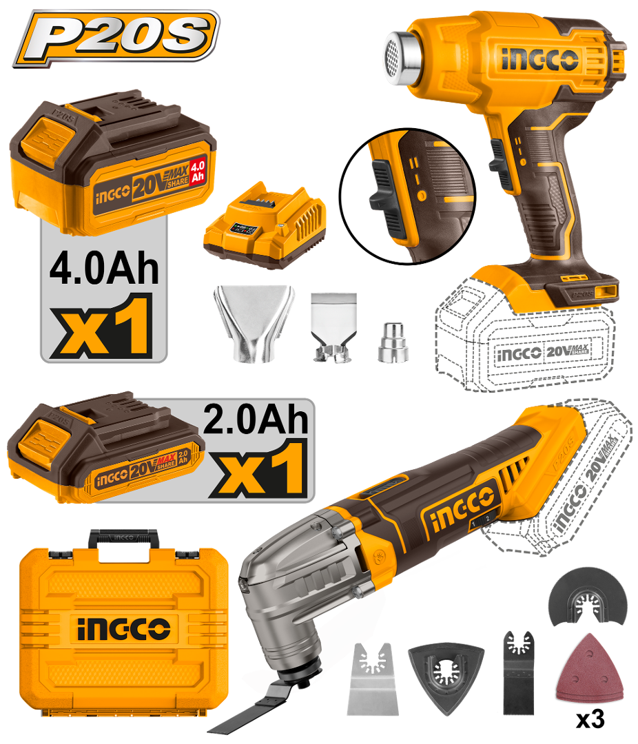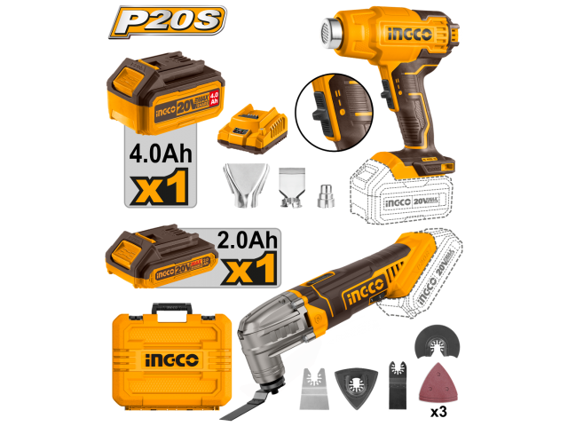 KIT 20V P20S PISTOLA DE CALOR + HERRAMIENTA MULTIFUNCION A BATERIA C/CARG C/BAT INGCO COSLI230703
