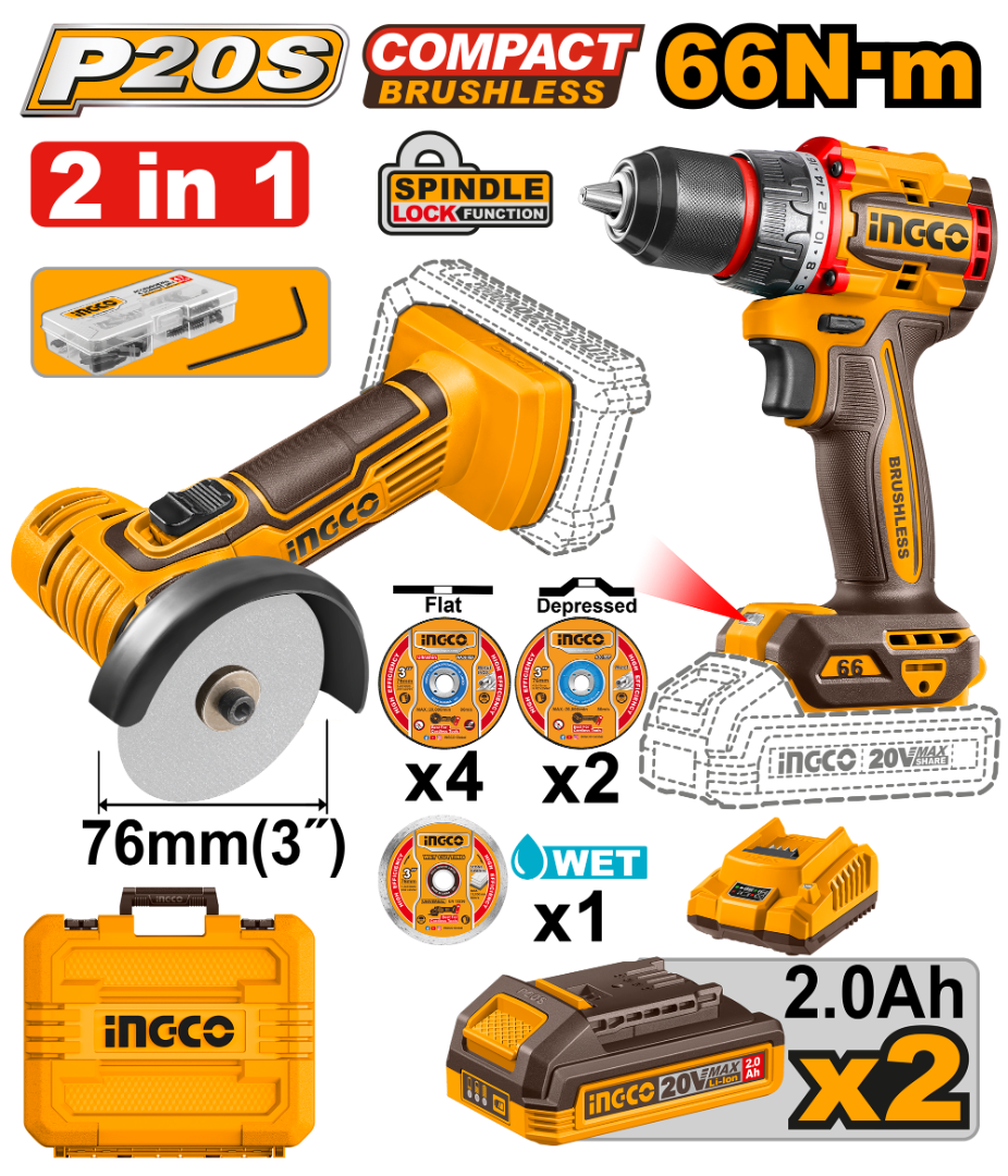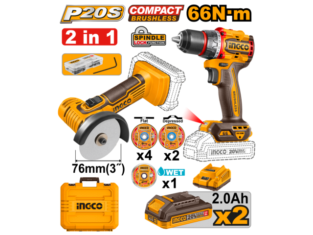 KIT A BATERIA P20S 20V MINI AMOLADORA 3" MULTIFUNCION + TALADRO ATORNILLADOR 66NM + 2BAT, CARGADOR, VALIJA Y ACCESORIOS
