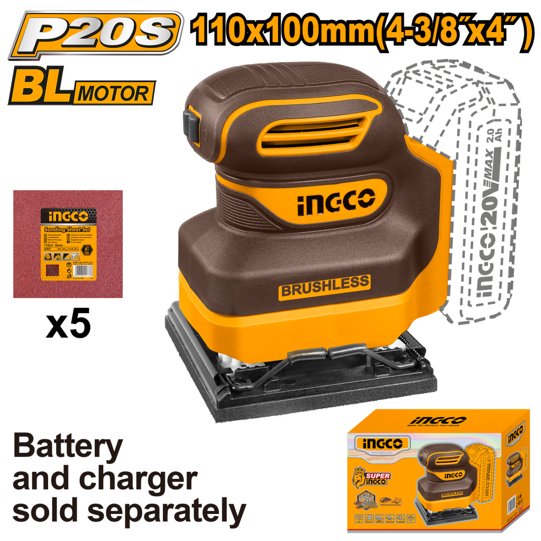 LIJADORA ORBITAL 20V P20S + 5 LIJAS SIN BAT SIN CARG INGCO CSHSLI2024
