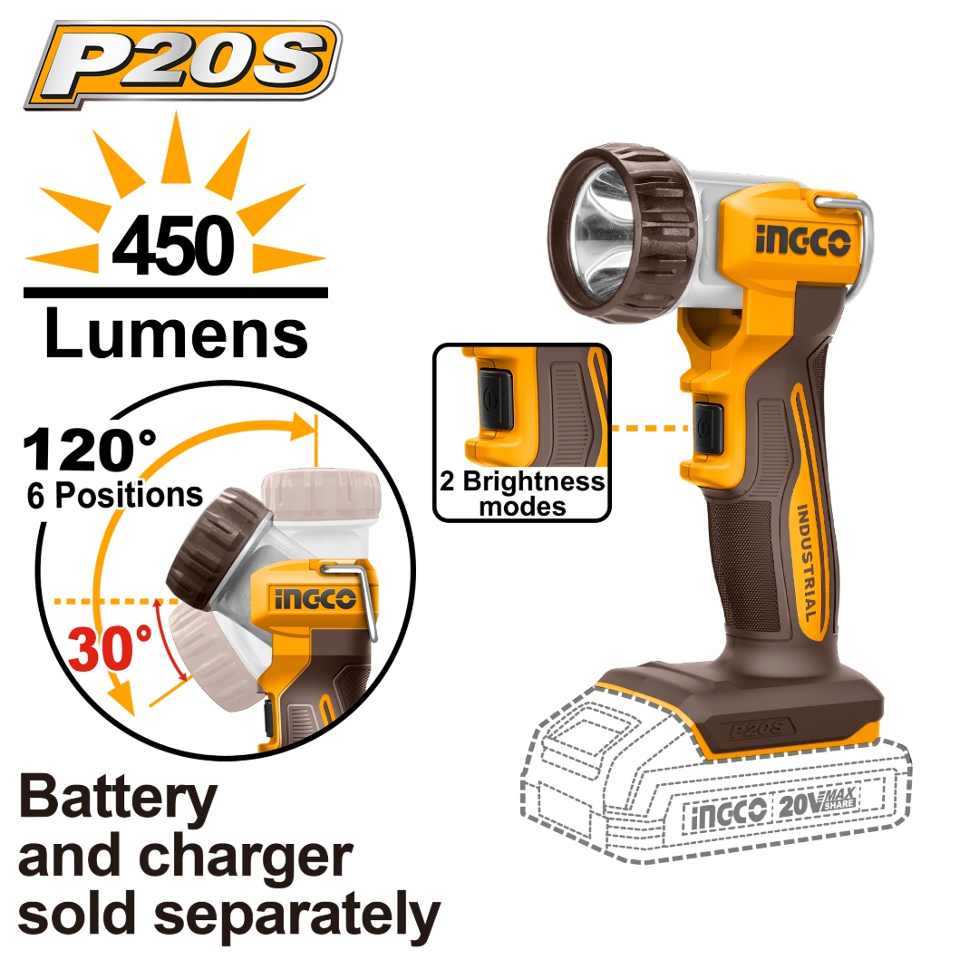 LINTERNA A BATERIA 450 LÚMENESP20S  20V S/BAT S/CARGADOR  INGCO CWLI2058