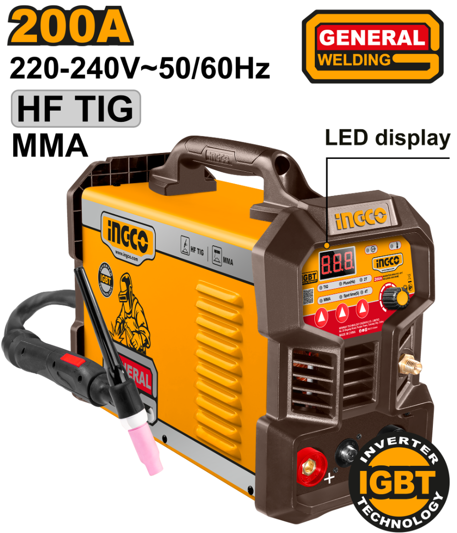 SOLDADORA INVERTER TIG/MMA 200A 220-240V LCD IGBT CON ACCESORIOS INGCO ING-TIG20058