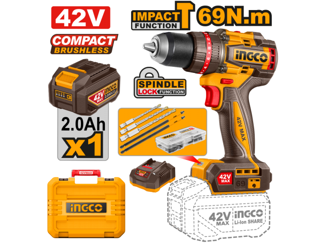 TALADRO ATORN. C/PERCUTOR A BATERIA 42V 69NM BRUSHLESS C/ BATERIA + CARGADOR + VALIJA + ACCESORIOS