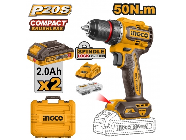 TALADRO ATORNILLADOR A BATERIA 20V 50NM CON 2 BAT 2.0AH + CARGADOR + ACCESORIOS + VALIJA INGCO CDLI205062